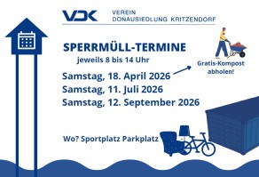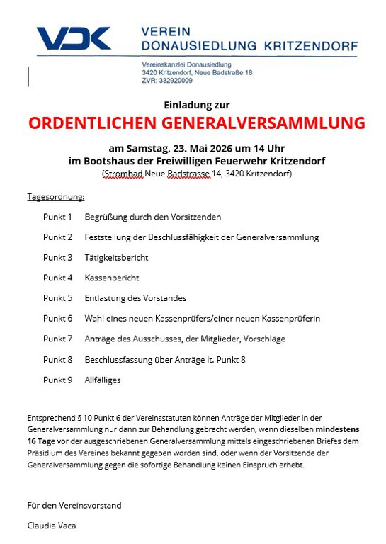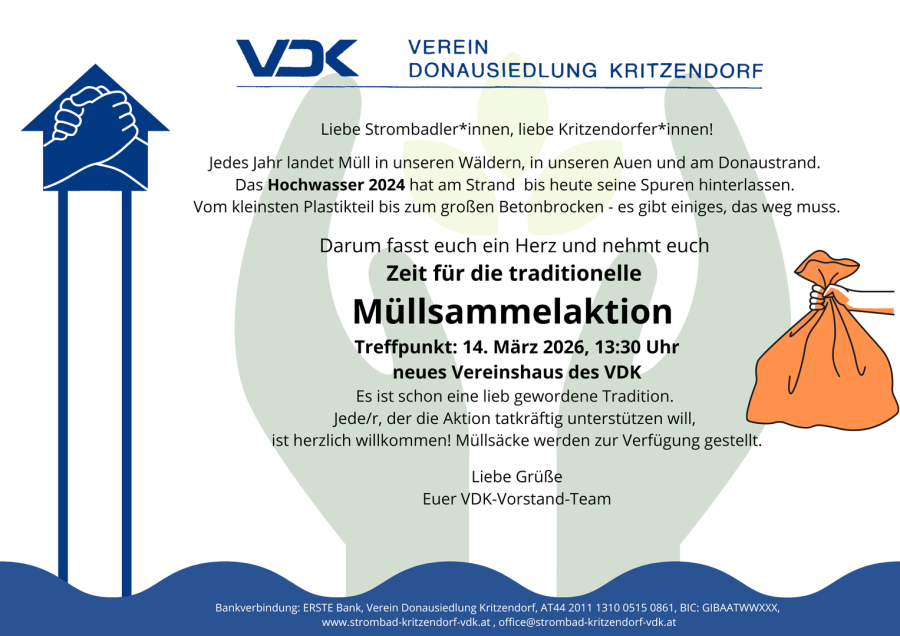 Bankverbindung: ERSTE Bank, Verein Donausiedlung Kritzendorf, AT44 2011 1310 0515 0861, BIC: GIBAATWWXXX